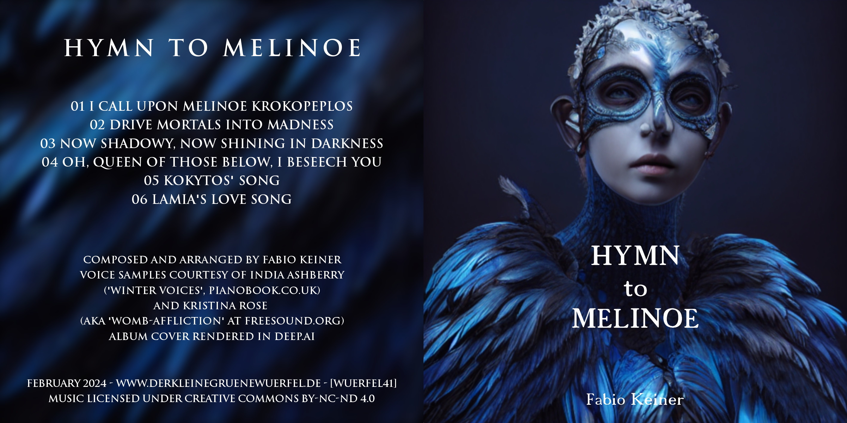 Mit dieser Veröffentlichung betreten wir (wieder einmal) einen neue Klangraum. Er wird ambient, lyrisch, ein wenig abstrakt elektronisch, experimentell aber auch sinnlich, mystisch. Fabio Keiner hat sich für seine Reise in die Zwischenwelt von den altgriechischen orphischen Hymnen inspirieren lassen, genauer von dem Hymnus an Melinoe. Wir empfehlen allerdings, zunächst einmal ohne weiteren Informationen zuzuhören und den „Gesang“ auf sich wirken zu lassen.